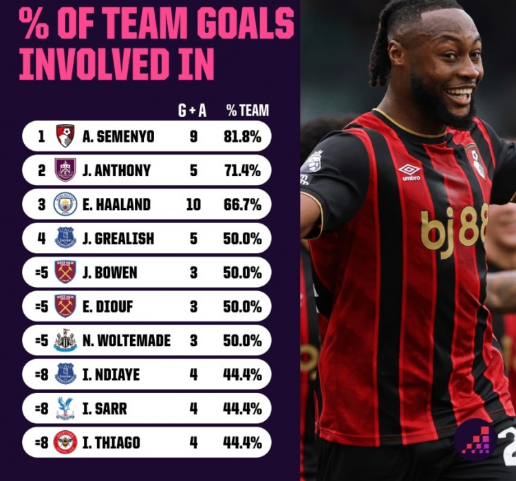 塞梅尼奧本賽季的進球貢獻達到9個,占伯恩茅斯總進球數的81.8%,這一數據在英超中名列前茅