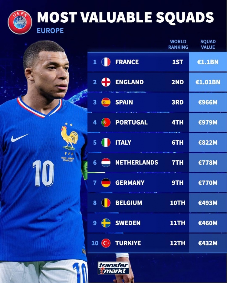 歐洲國家隊身價排行榜:法國以11億歐元位居第一,英格蘭以10.1億歐元緊隨其後