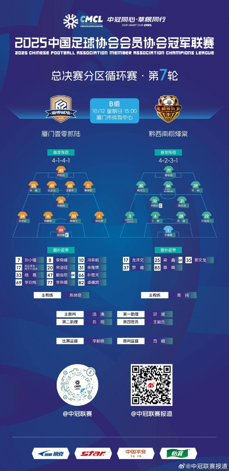 在10月12日的中冠決賽階段分組賽第7輪中,廈門壹零貳陸將主場迎戰黔西南栩烽棠,比賽將在廈門市體育中心舉行。雙方的首發陣容已正式公布,廈門壹零貳陸方面,由於近期狀態良好的張越獲得首發機會,盧致遠則擔任起前鋒的角色。